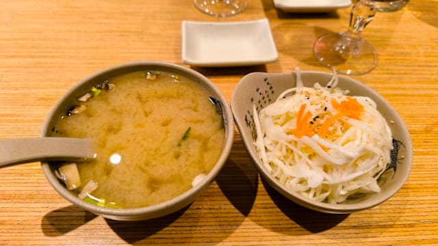 8 pièces sushi saumon, servi avec soupe miso et salade de chou. Inclus wasabi, gingembre et sauce soja.