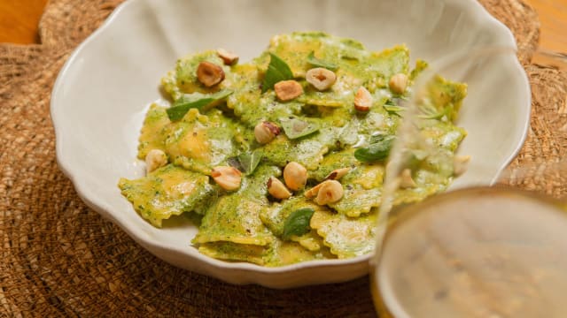 - Ravioli stuffed with ricotta and lemon, homemade pesto, grana cheese and hazelnuts