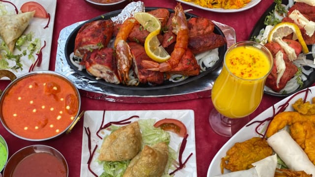 Cordero, pollo tikka y langostinos preparado con una salsa de especias variadas