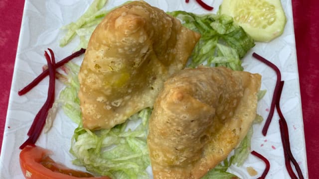 Trozos de pollo tikka, dos piezas de seekh kebab y samosa de verdura