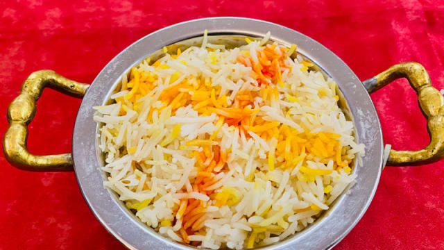 Verduras mixtas fritas con arroz bastami servido con salsa de curry.