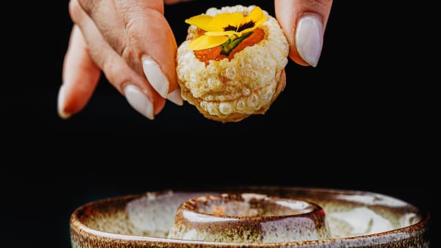Atum com especiarias, sate, azeite com ponzu, maionese japonesa e tobiko