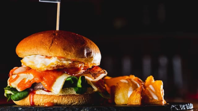 Bacon crujiente, queso belga fundido, canónigos, huevo, confitura de pimiento rojo. En pan brioche. Acompañada de patatas ali oli.