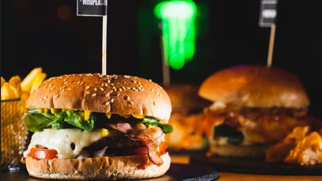 La whiplash de siempre, pero con el doble de todo. Opción smash si eres moderno. En pan de sésamo. Acompañada de patatas fritas.
