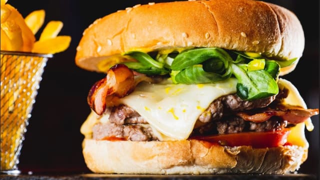 Bacon crujiente, queso belga fundido, canónigos, tomate, cebolla, ketchup y mostaza. En pan de sésamo. Acompañada de patatas fritas.