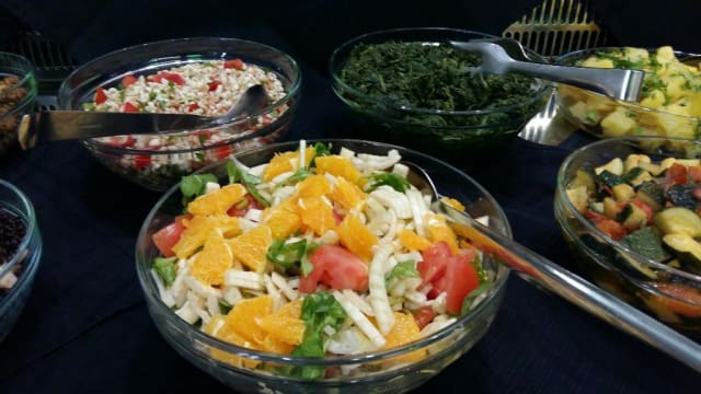 Misticanza, cavolo viola, uva, mela, kiwi, noci caramellate e fomaggio erborinato