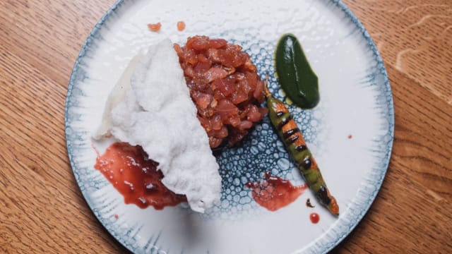 - Daurade en cube, jus de lime, oignons rouge, jalapeno, coriandre et concombre