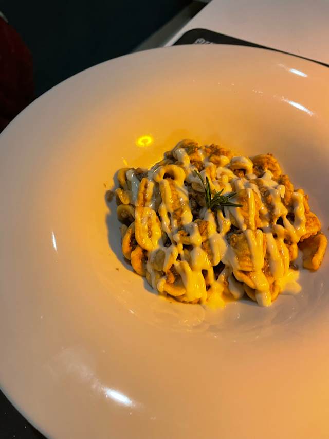 - Base bianca, fior di latte, salsiccia a punta di coltello, cime di rapa ripassate con acciughe, aglio e peperoncino