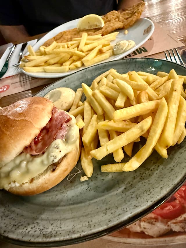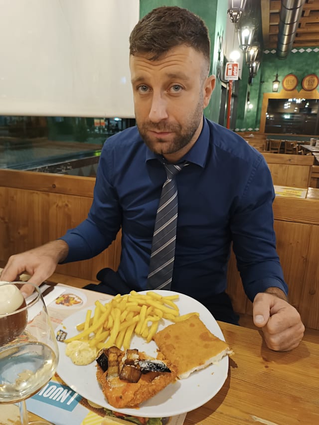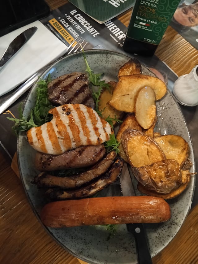 Spatzle* agli spinaci con salsa al gorgonzola, speck e noci, mini ljubljanska (cotoletta di tacchino* panata farcita con prosciutto cotto praga e formaggio gouda) e patate al forno
