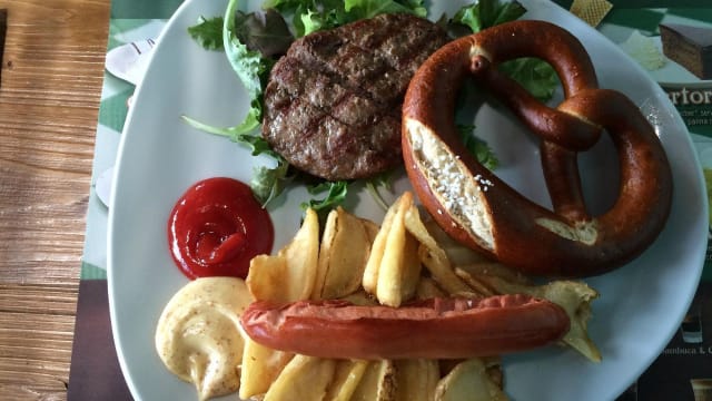 Panino briosciato*, hamburger, formaggio gouda, pancetta affumicata, lattuga, maionese, ketchup, accompagnato con patate* fritte e salsa wiener