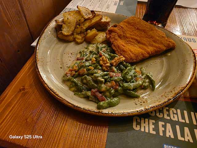 - Spatzle* agli spinaci con salsa al gorgonzola, speck e noci, mini ljubljanska (cotoletta di tacchino* panata farcita con prosciutto cotto praga e formaggio gouda) e patate al forno