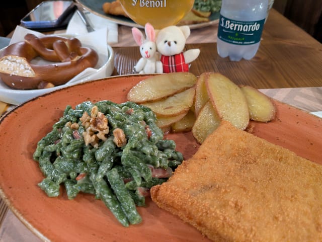 Spatzle* agli spinaci con salsa al gorgonzola, speck e noci, mini ljubljanska (cotoletta di tacchino* panata farcita con prosciutto cotto praga e formaggio gouda) e patate al forno