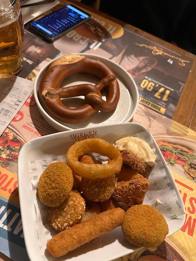 - 2 pepite di pollo, 2 crocchette camembert, 2 minimedaglioni, 2 bastoncini di mozzarella, 2 anelli di cipolla, 2 triangolini di rösti con speck, serviti con salsa wiener