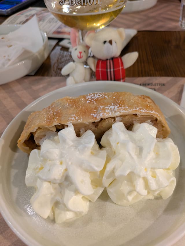 Strudel* di mele e uvetta, panna montata e zucchero a velo