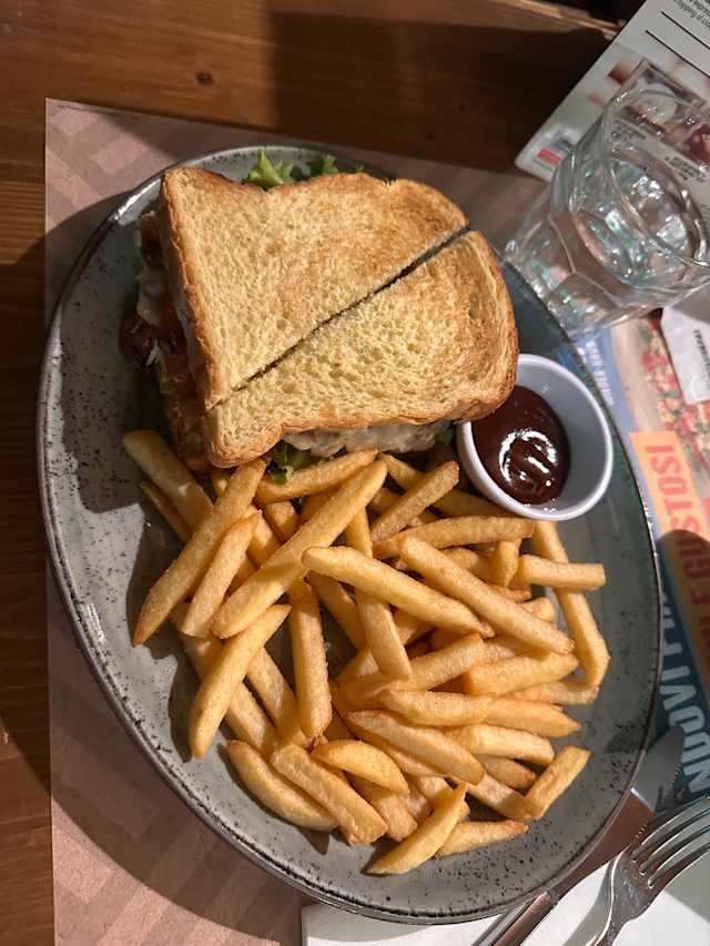- Pane* bianco tostato, salsa wiener, petto di pollo* arrostito, pancetta e scamorza affumicate, pomodoro, lattuga, servito con salsa wiener