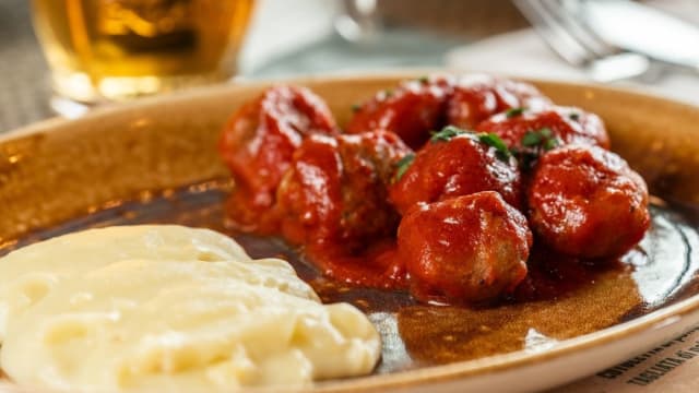 - Polpette di vitello, salsa al pomodoro, serviti con crostini di pane.