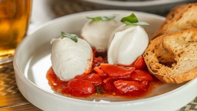 - Mozzarella di bufala campana DOP, pomodorini ciliegino confit, serviti con crostini di pane.