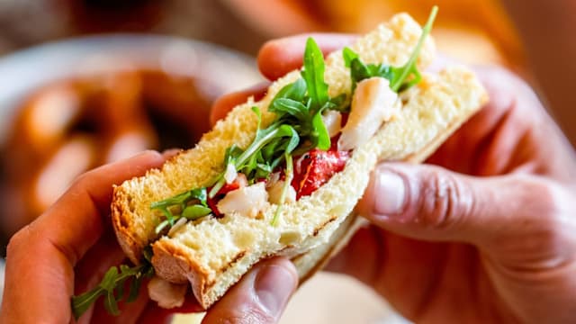 Panino briosciato*, hamburger, pomodoro, lattuga e salsa wiener