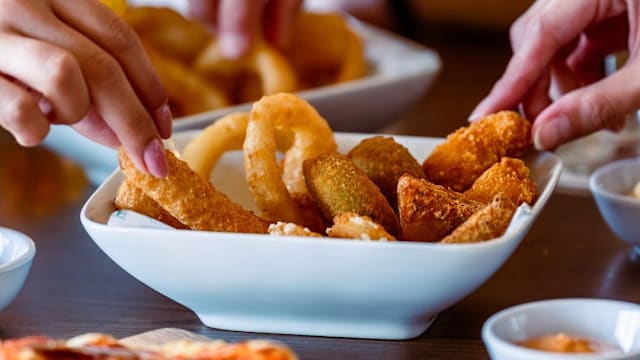 Anelli* di cipolla pastellati alla birra e fritti, serviti con salsa speziata.