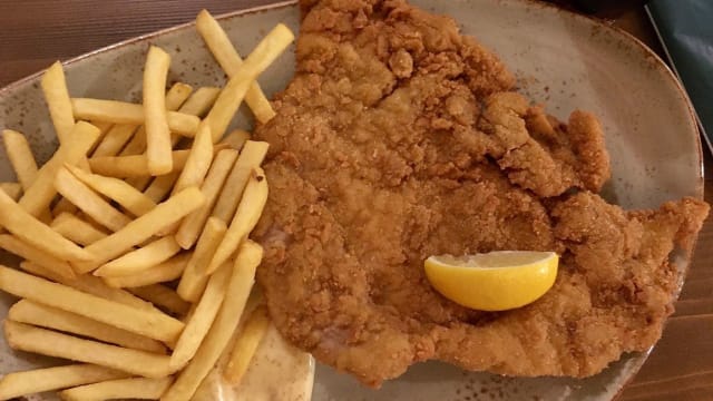 Cotoletta* panata con crema al parmigiano reggiano DOP e pancetta affumicata accuratamente grigliata