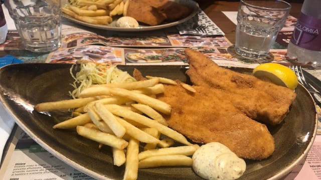 Mini cotoletta di pollo* panata, servita con patate* fritte e salsa ketchup
