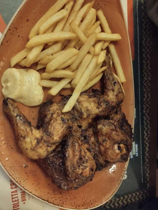 - Pane* bianco tostato, salsa wiener, petto di pollo* arrostito, pancetta e scamorza affumicate, pomodoro, lattuga, servito con salsa wiener