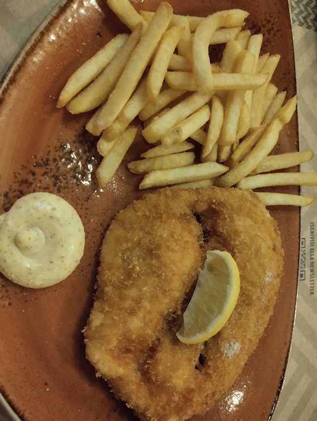 - Insalata mista in foglia, cotoletta di tacchino* panata, prosciutto cotto praga, pomodorini, crostini di pane* dorati e salsa wiener