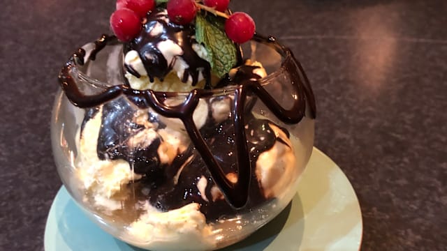 - Vanille, aardbei, chocolade ijs met wafel en topping van sprinkles keuze uit aardbei of chocolade saus