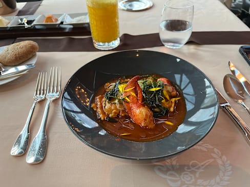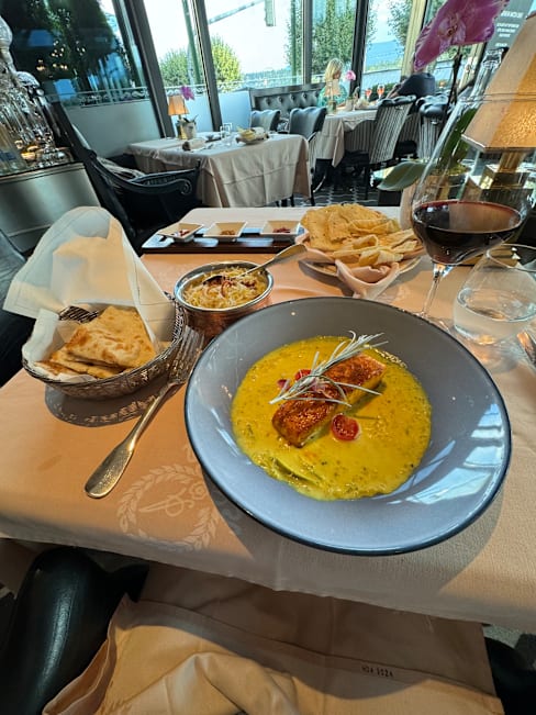 10/10What a beautiful and romantic setting. The view of the lake at night was amazing and the lighting in the restaurant itself really enhanced the ambiance. Staff was most accommodating and pleasant. We were assisted in selecting a local red Syrah that was very well described and much to our liking. My husband had the filet which was delicious and prepared exactly as he wished. I had the curry chicken, which is one of the restaurant’s signature dishes. My meal was superb and the mango chutney complemented the meal perfectly. If we are lucky enough to travel from the US to Geneva in the future, I would dine here again. What a memorable evening!