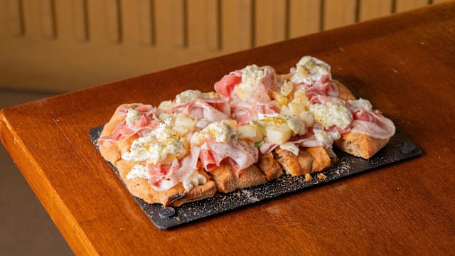 Cooked ham, truffle cream, rosemary-flavored potato cream, and mozzarella
