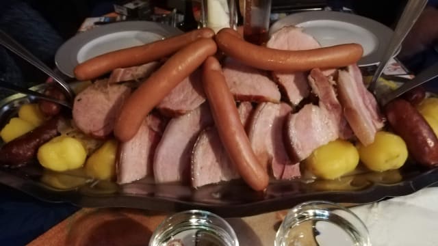Choucroute accompagnée de 5 sortes de viandes + pommes de terre.