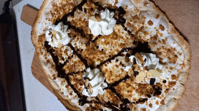 Pate fine recouverte de fromage blanc + spéculos broyés + chocolat chaud "maison" + chantilly.