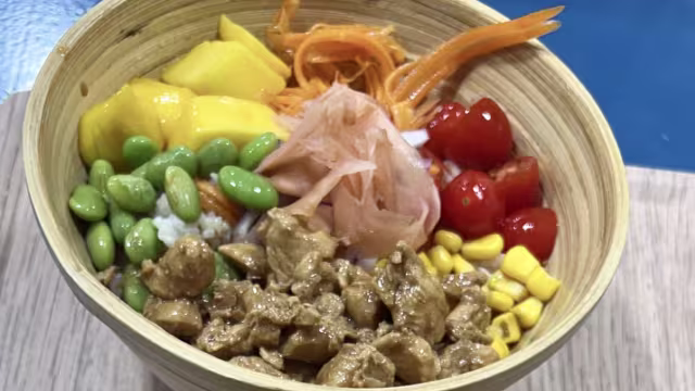 - Thon cuit, ananas, edamame, salade de choux, carotte