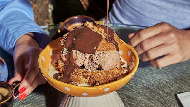Ice cream, customize it with 2 toppings of your choice: chocolate sauce, salted butter caramel, almond crumble, red fruit sauce