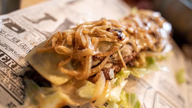 Panino con doppio hamburger di manzo*, doppio formaggio emmental, lattuga iceberg, pomodoro, cipolla grigliata, maionese, ketchup
