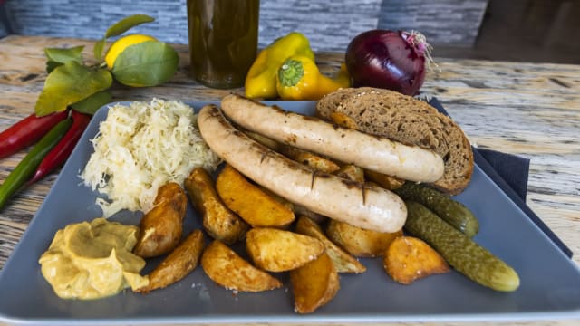 Salsiccette bianche di norimberga grigliate, patate gourmet*, crauti, cetriolini, pane ai 4 cereali, senape, salsa tartara