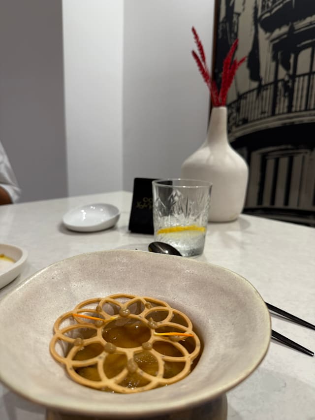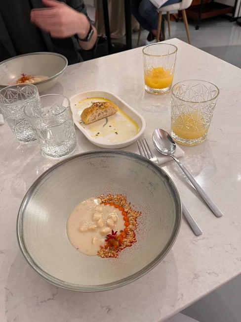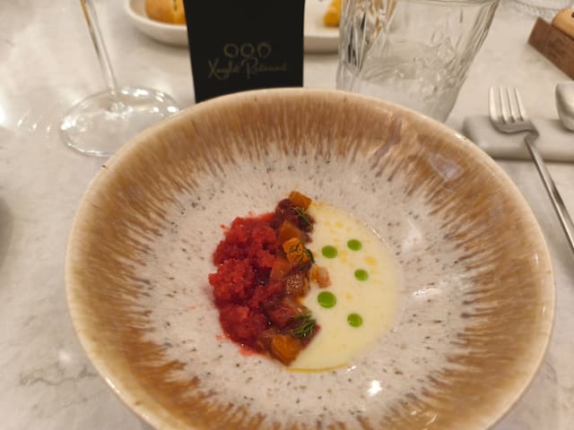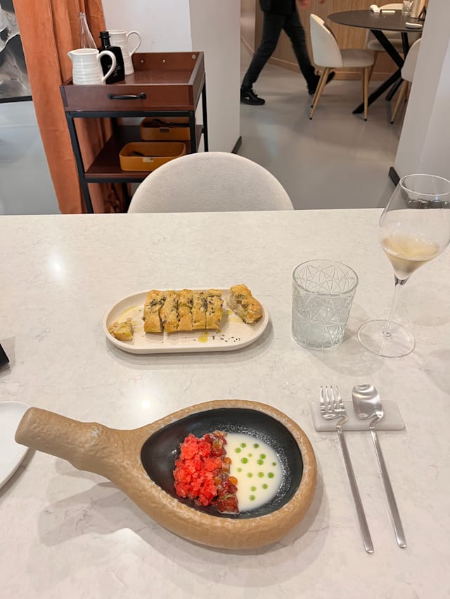 4.5/10We have been received nicely by everyone in this restaurant. There was a weird fart smell from the entrance till the hall. You have to walk to get to this little sitting area of 3 tables in the middle of the alcohol bottles holder and a fridge (wine cave) and toilet… There is almost no decoration. Only plain white walls with very few printed art. The waiters were lovely, and speaks both spanish, and english perfectly! The service is great. But the food… it’s good, but not wow! There was no wow at all. Ot was not a Michelin good food you’re expecting. The quantities also! The amount of food of the 4 course meal were so little, so tiny, it was less than gastronomic amounts. Especially the main course, the duck it was ridiculously small to serve even as a starter! And the desert same 2 bites or not even! For 60€/pers it’s not worth it! You pay extra of course for water 4€ each small bottle and 2.5€ for coffee. Anyway, We were not impressed. I hope you read this review and make changes :)