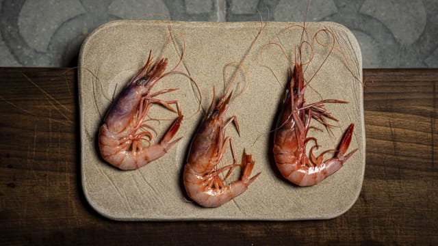 Carpaccio de gamba roja con bisqué de sus cabezas