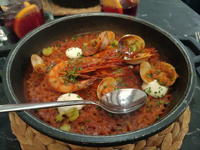 - Paella de marisco, gamba, calamarcito, almejas & alioli