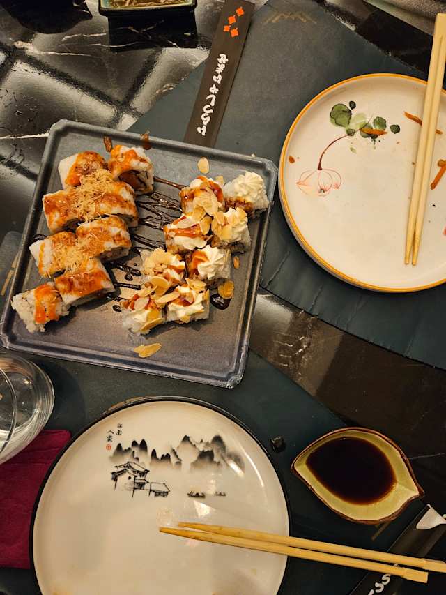 - (in: salmone cotto, peperone fritto, Out: philadelphia, mandorle, salsa teriyaki)