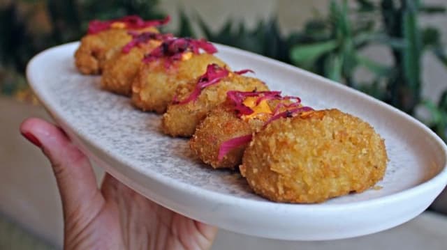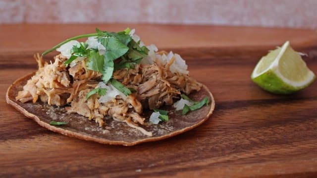Carne de cerdo a baja temperatura estilo michoacán con ligero toque de habanero.