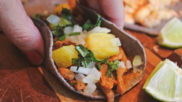 Carne marinada al pastor, con piña asada, cilantro y cebolla blanca.