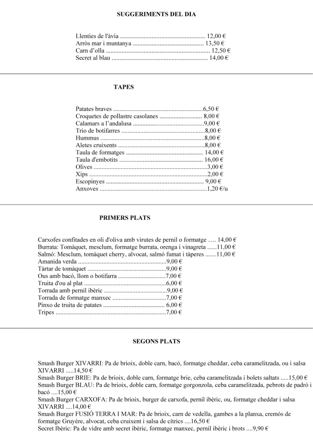 CatalanSpanishEuropeanBurgerCroquettesDuck LiverSandwicheTruffleWinter foodBookable terraceBrunchFrom marketIn the mountainsRomanticTraditionalDog-FriendlyWheelchair AccessibleWifi