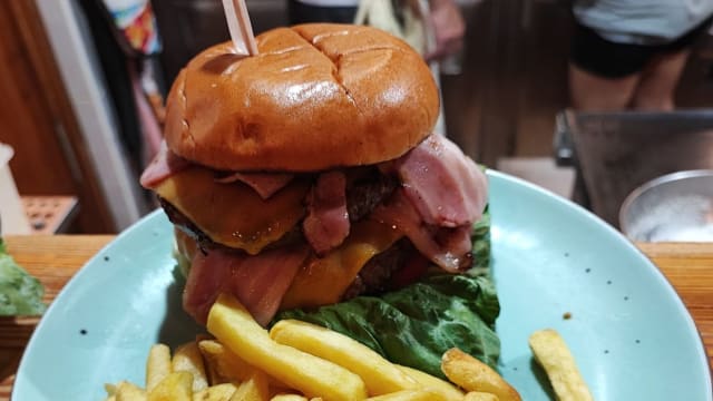 Pa de brioix, doble carn, formatge gorgonzola, ceba caramelitzada, pebrots de padró i bacó