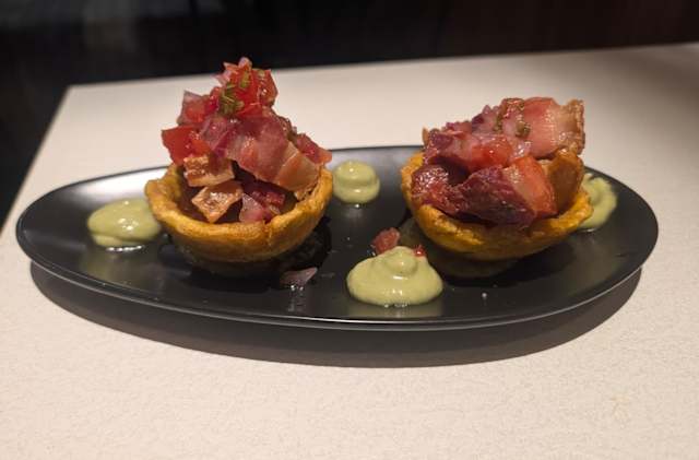 - Relleno de queso mahón, lacón y bacon, con salsa verde y salsa portobello acompañado de patacones y yuca.