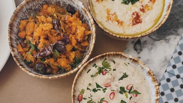 Puré de beterraba, tahini fumado, za'atar, harissa caseira e especiarias