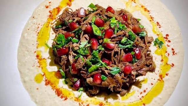 Pequenas fatias suculentas de carne de vaca temperadas com especiarias za'atar em cima de uma generosa porção de húmus caseiro