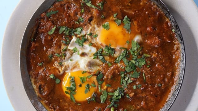 Tomates, pimentos, alho, harissa, ervas aromáticas, ovo escalfado e salsicha picante de vaca e borrego