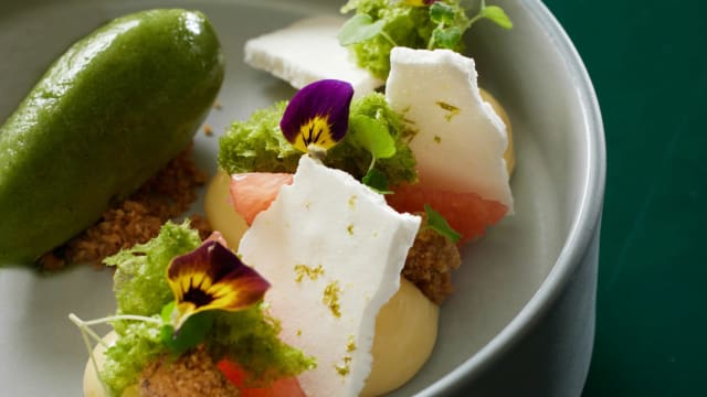 Sorbet Yuzu, Crème Citron Sponge Cake Basilic et Meringue
