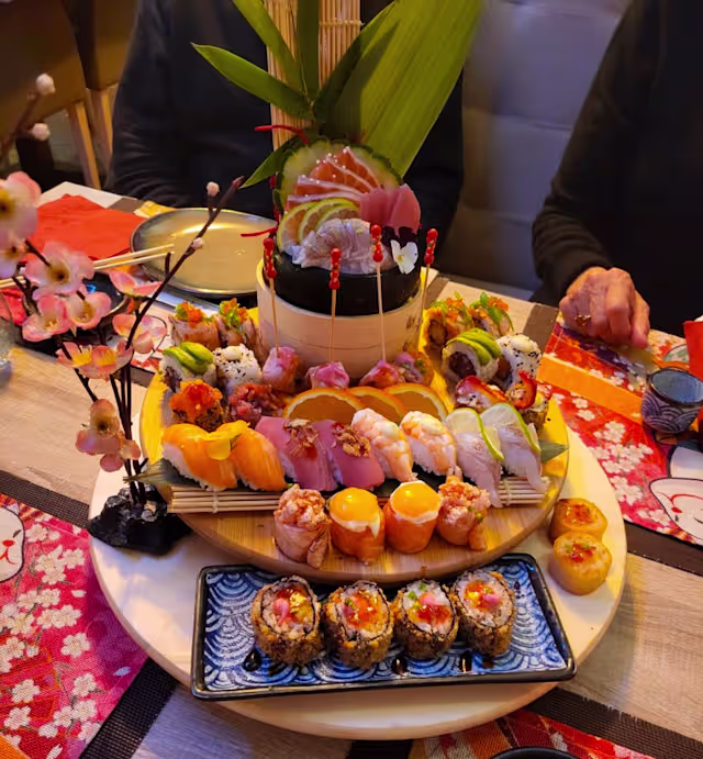 - Base de arroz embrulhada em fatias de peixe por fora e recheada por cima